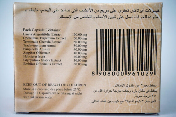 - Ayulax Capsules: acts gently to flush out the bowels, relieving the person from constipation. It flushes and cleanses the stomach of unwanted elements and toxins.
