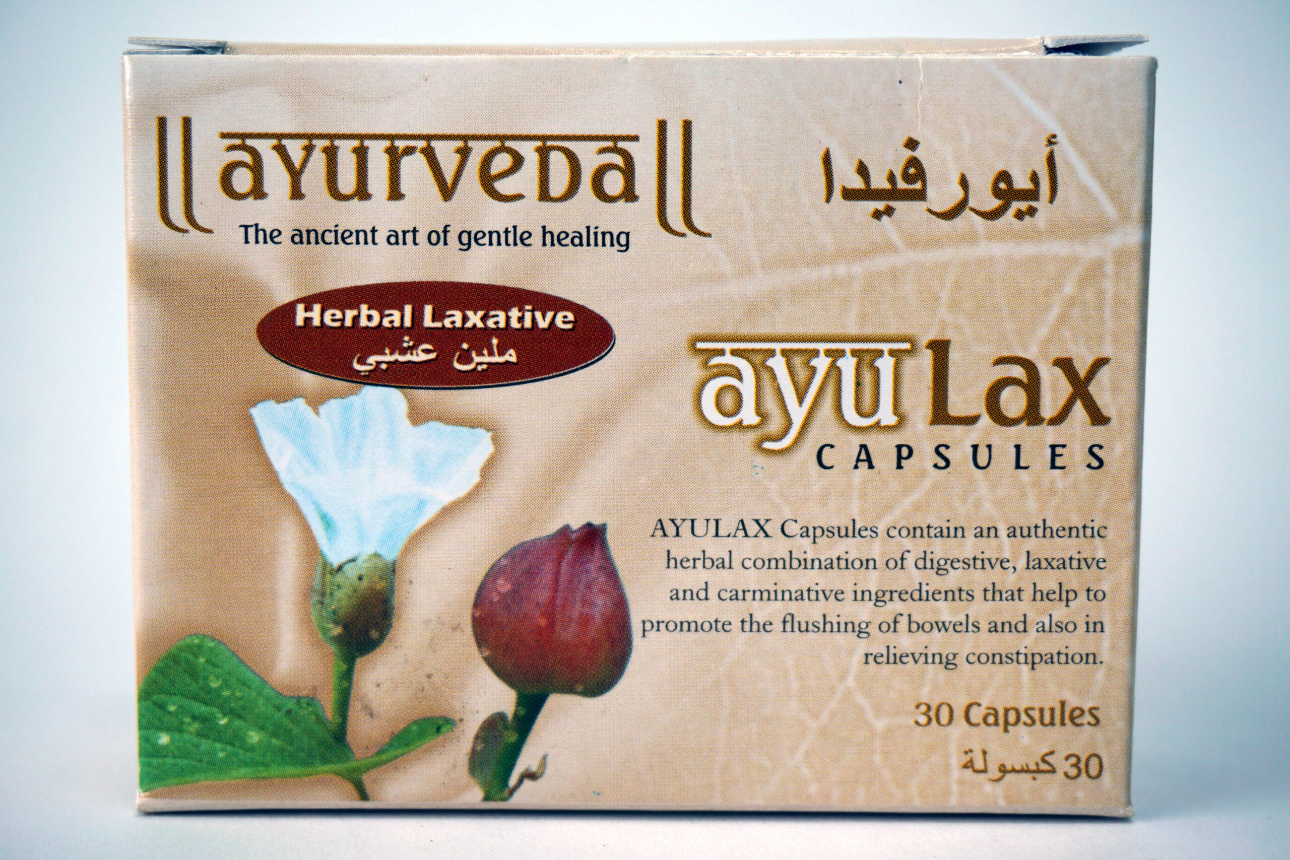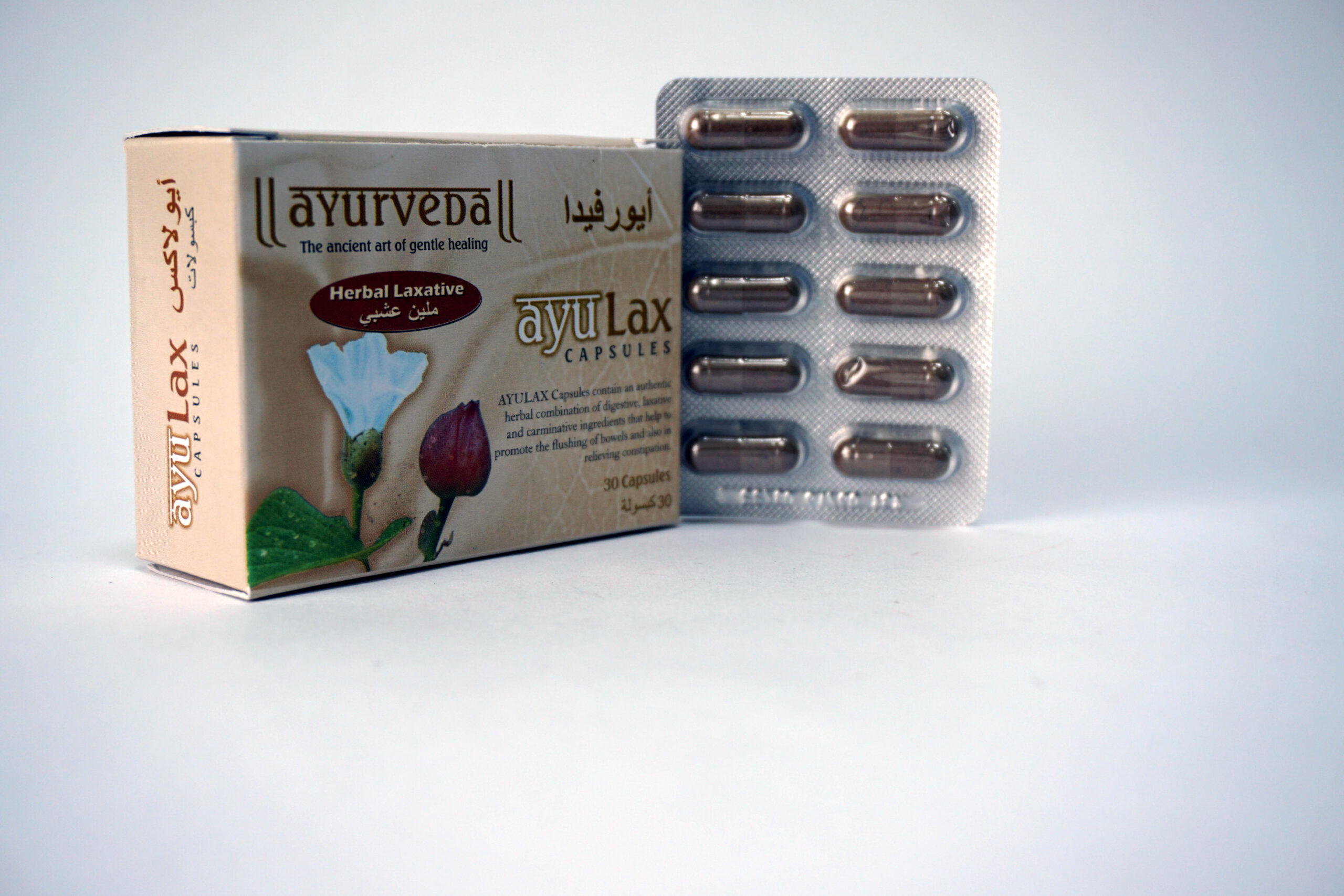 - Ayulax Capsules: acts gently to flush out the bowels, relieving the person from constipation. It flushes and cleanses the stomach of unwanted elements and toxins.