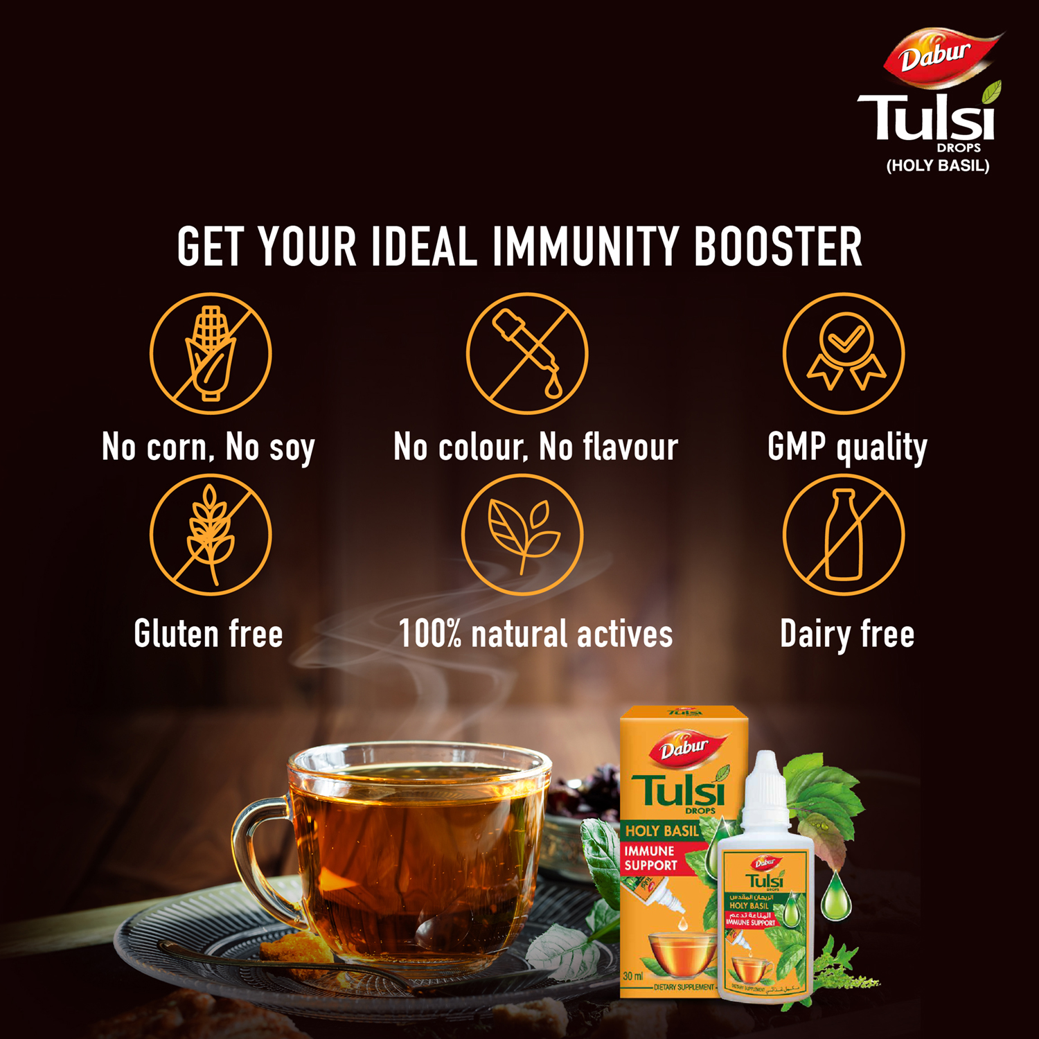 • Dabur Tulsi Drops consists of rare medicinal extracts that help in building the immunity for everyone in your family.