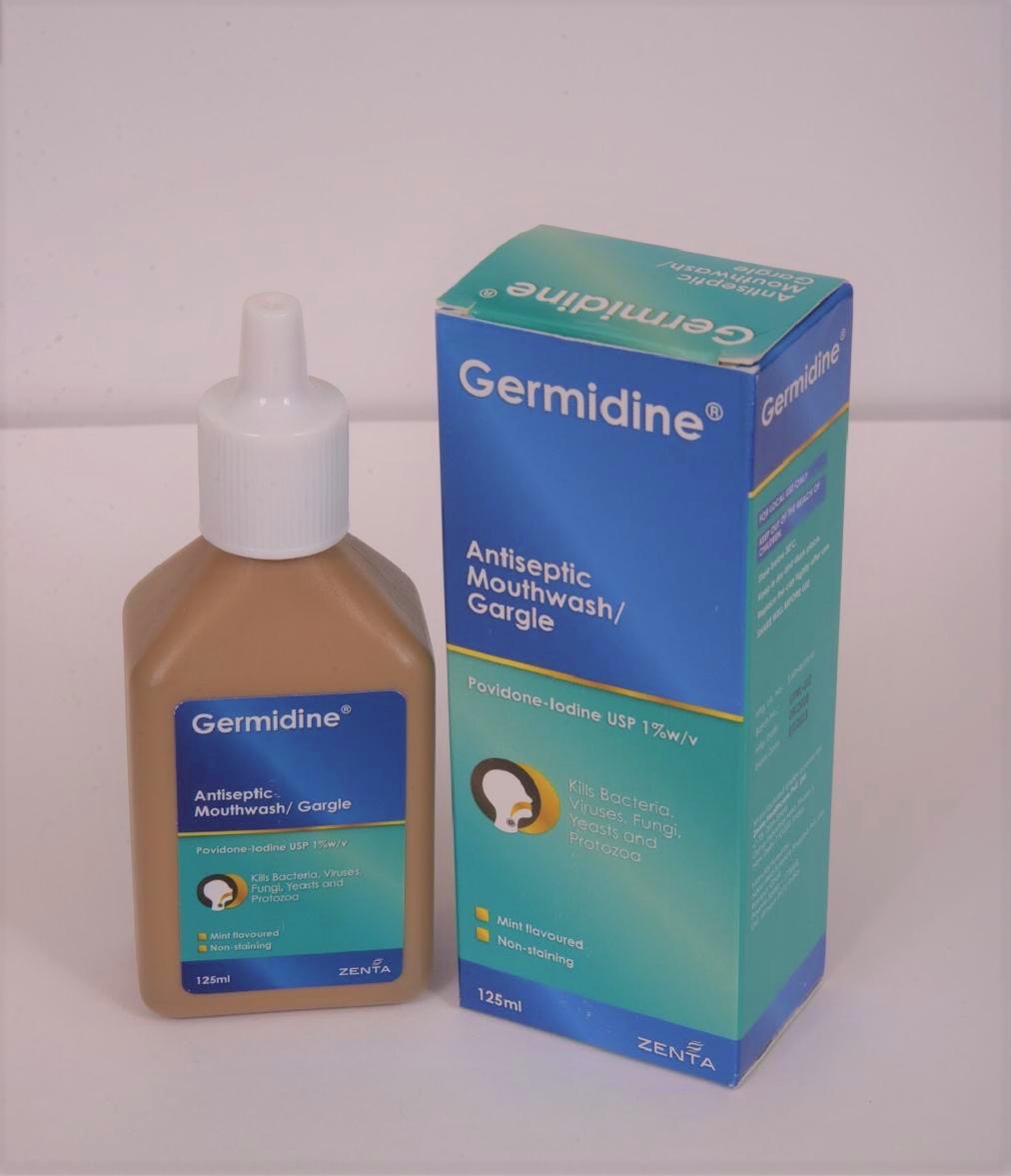 - Germidine Antiseptic Mouthwash/Gargle with alcohol is faster acting with a broader spectrum of antimicrobial activity. It is used for the treatment of acute infections of the lining of mouth and throat, inflammation of the gums and mouth ulcers. Recommended as daily mouthwash and for cleansing of mouth before, during and after dental and oral surger, Quick relief from gums inflammation and mouth ulcers.
