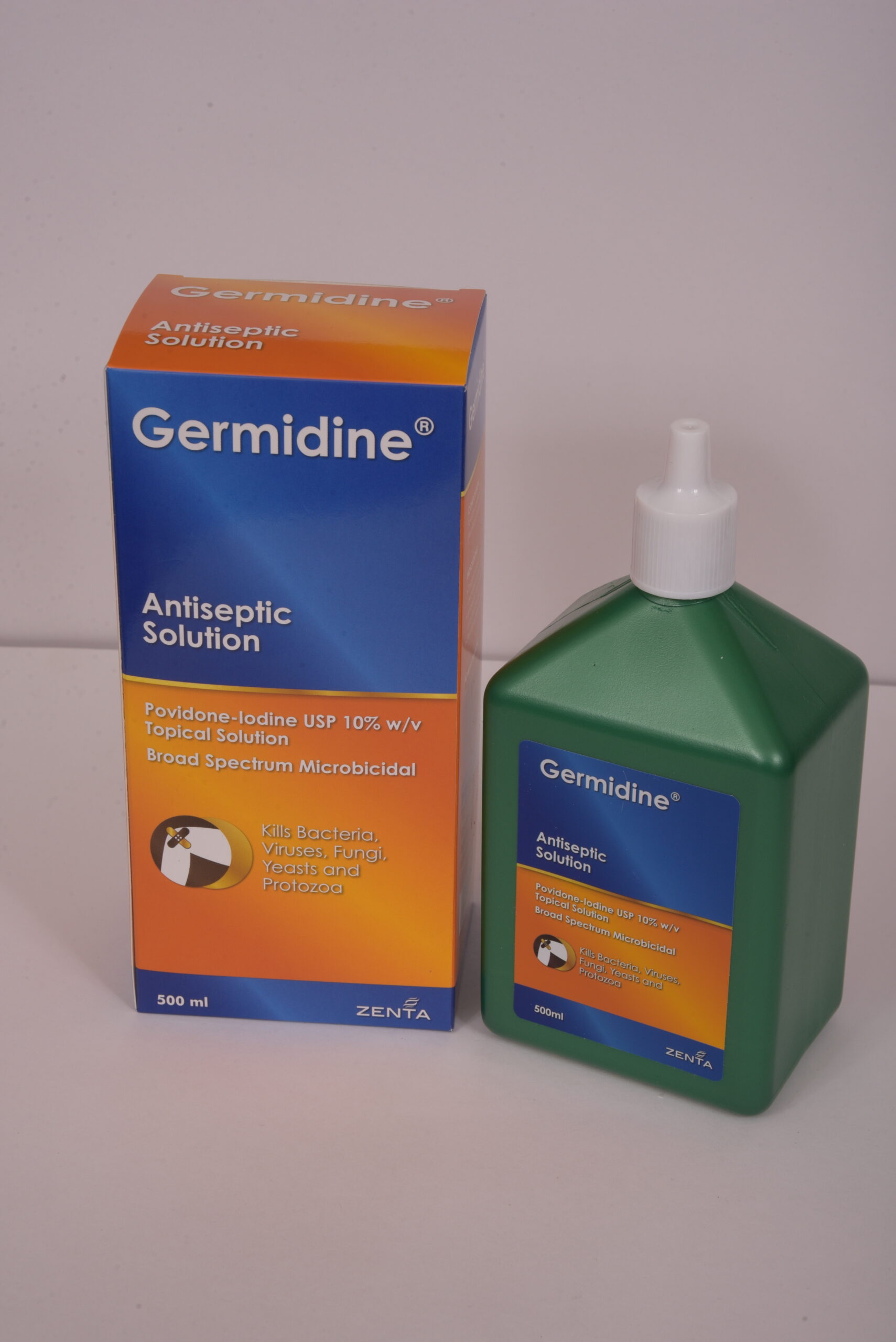 - Germidine Antiseptic Solution contains Povidone-Iodine, a trusted active ingredient which is effective against all pathogens and kills bacteria, fungi, yeasts, protozoa and viruses even in the presence of blood, serum, pus and necrotic tissue, Degerming of the skin before and after surgical procedures.